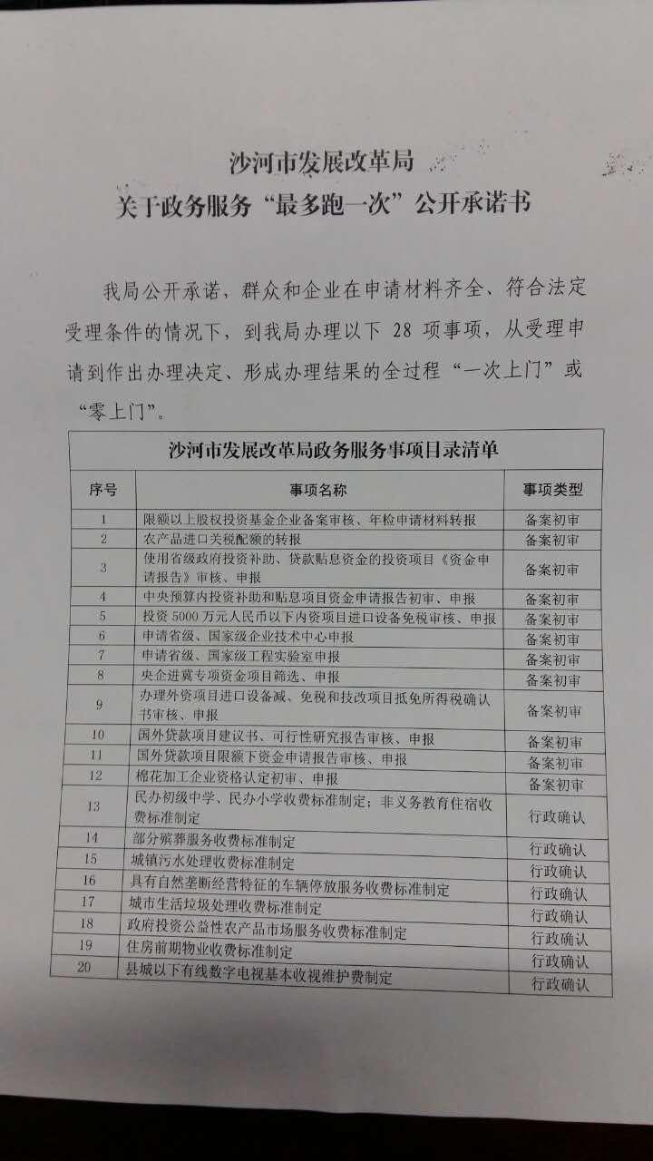 沙河市发展改革局关于政务服务“最多跑一次”公开承诺书;