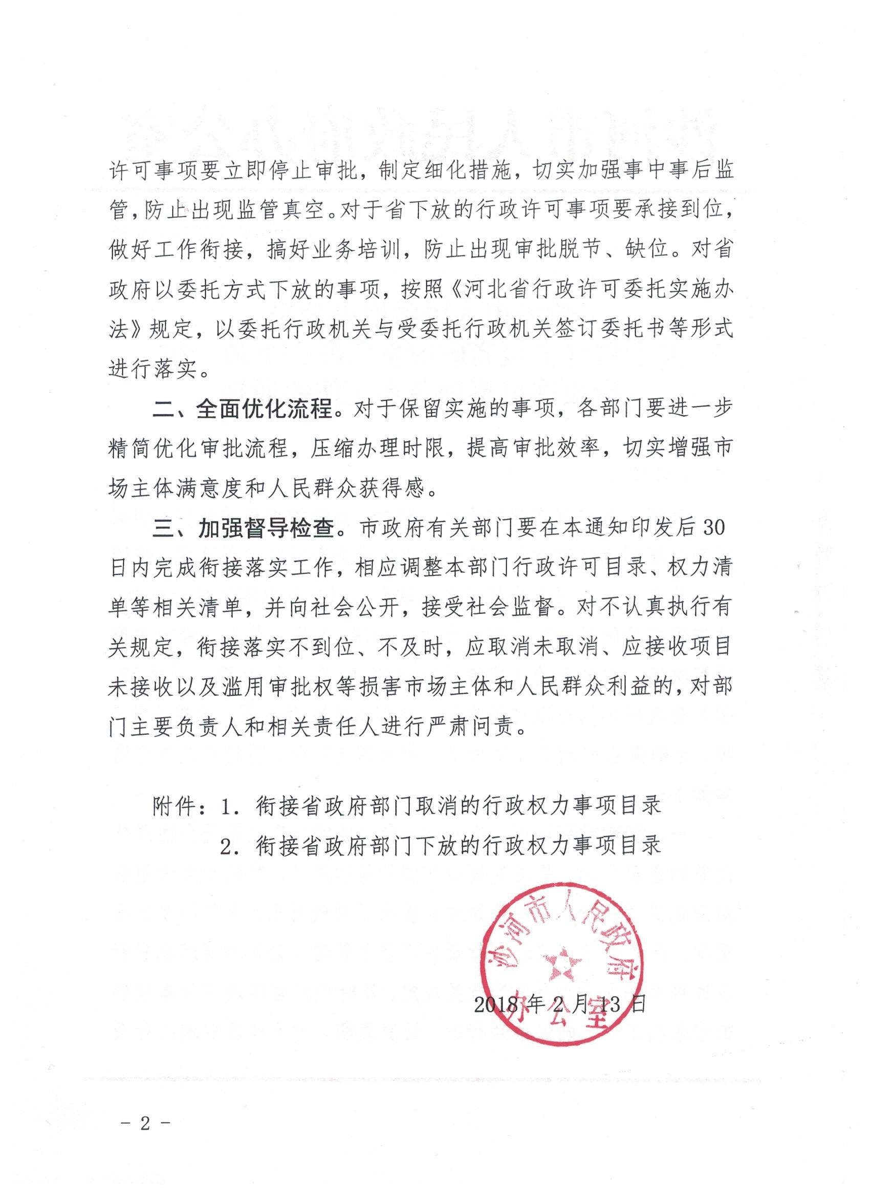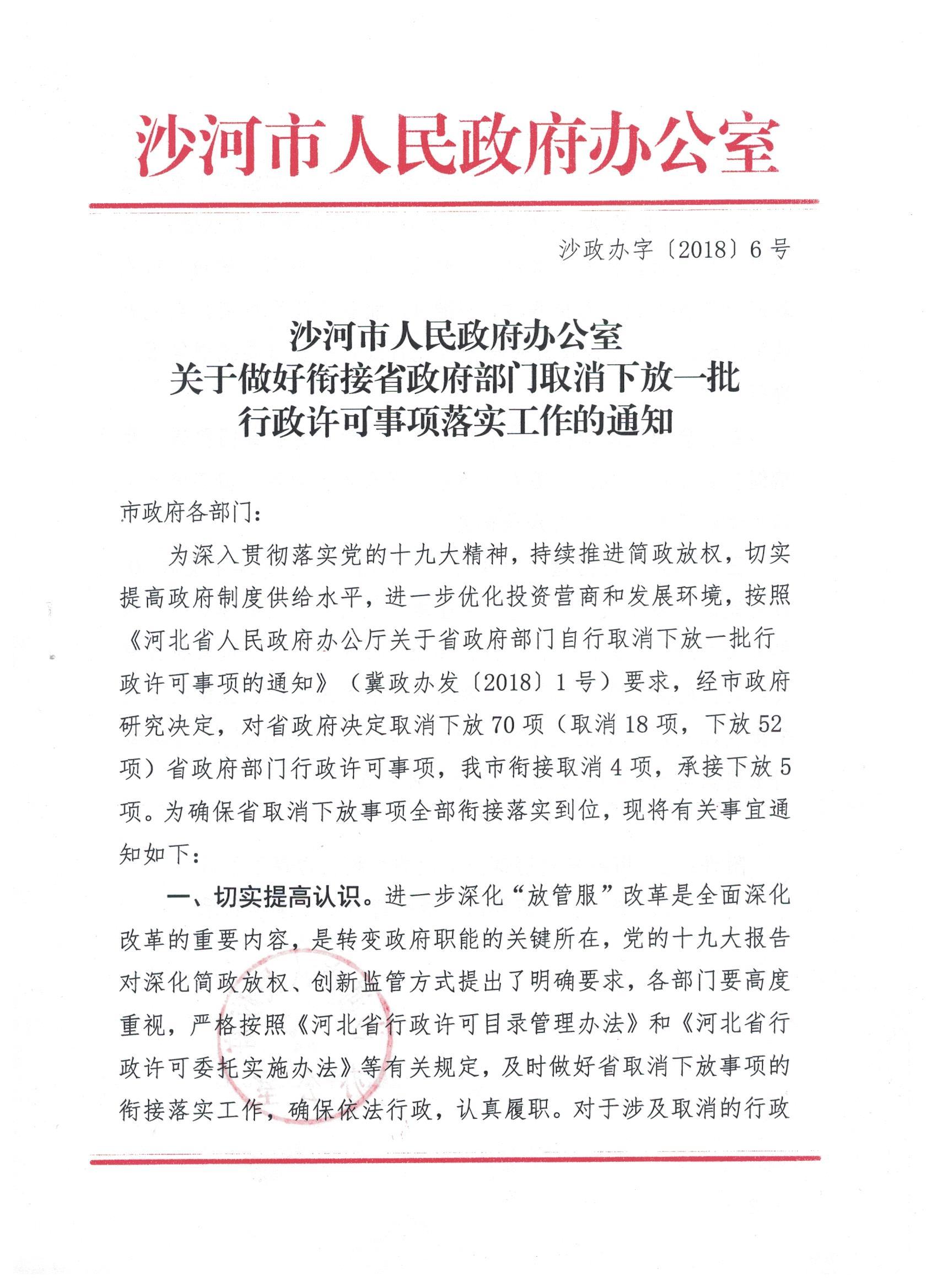沙河市人民政府办公室 关于做好衔接省政府部门取消下放一批 行政许可事项落实工作的通知